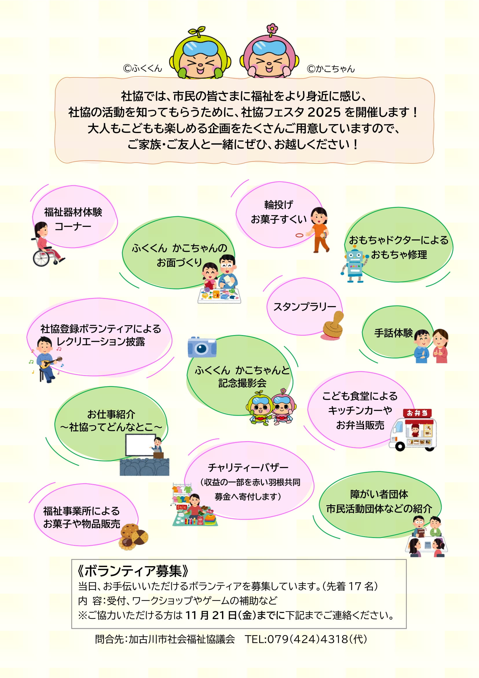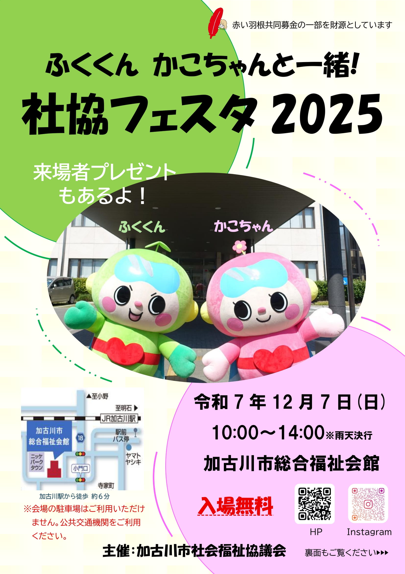 令和7年12月7日(日)10:00~ 加古川市総合福祉会館にて「ふくくん かこちゃんと一緒!社協フェスタ2025」を開催します!参加費は無料で、来場者プレゼントもあります。みなさんの来場をお待ちしております♪