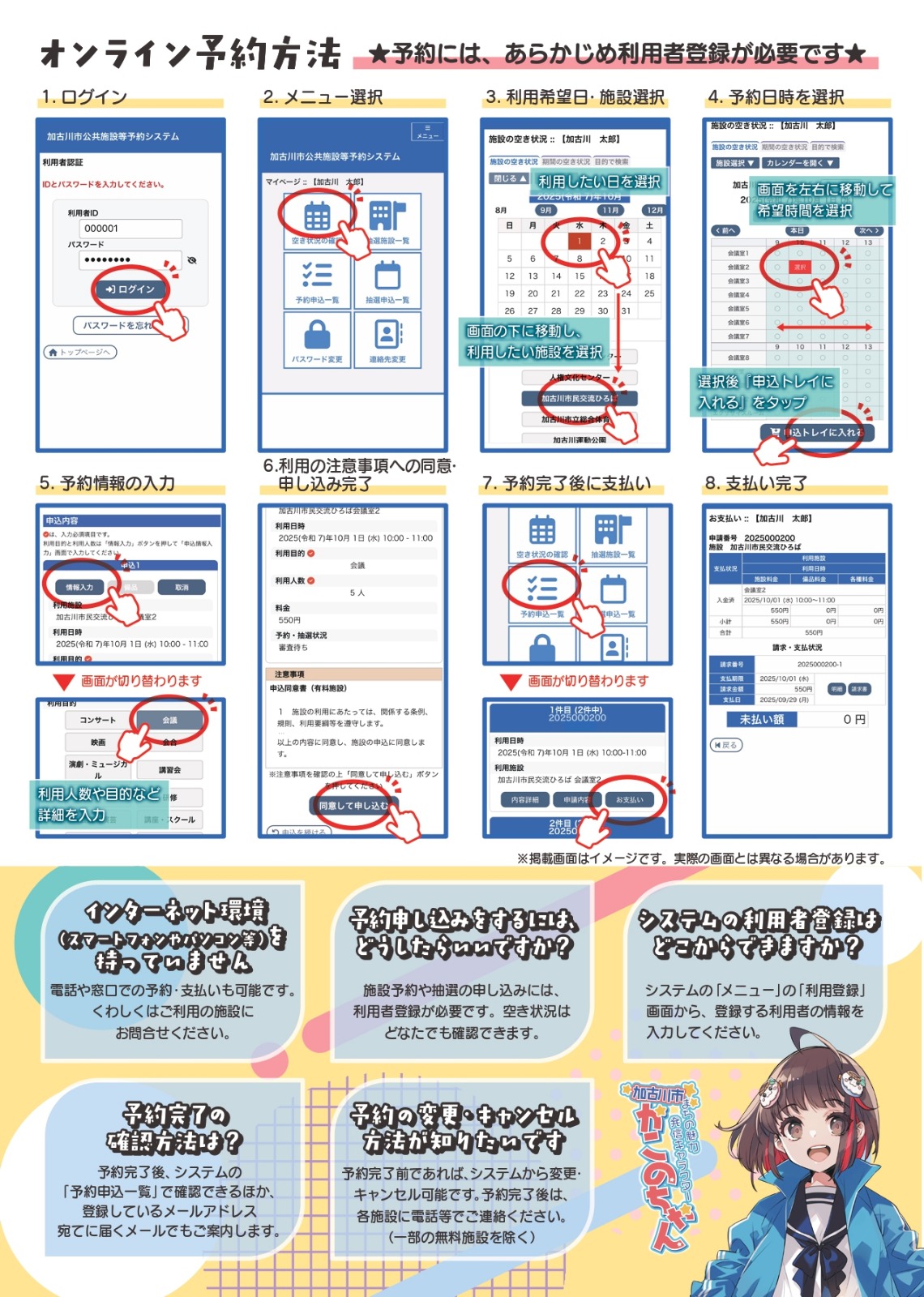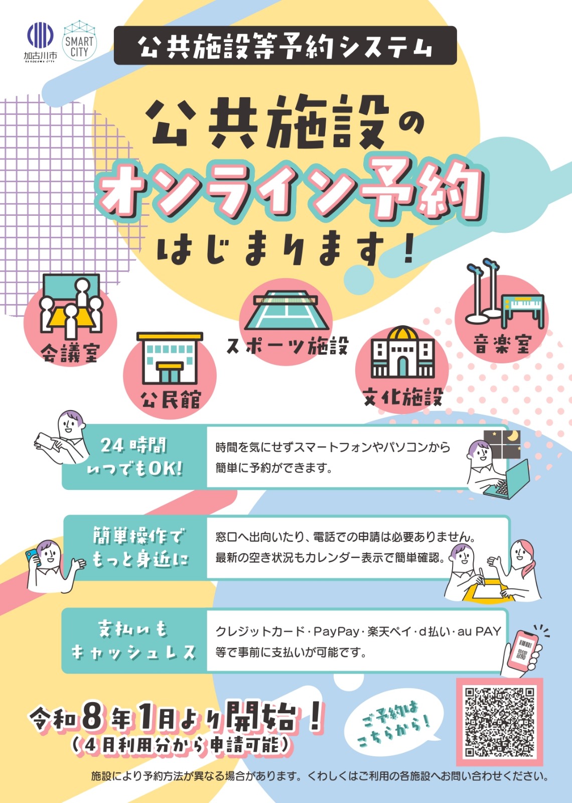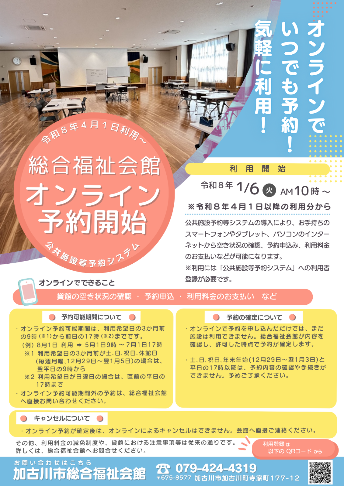 令和8年1月6日から加古川市内において、公共施設等のオンライン予約がはじまります。それに伴い、本会が管理している総合福祉会館のご利用についても公共施設等予約システムを通してのご予約になります。詳しくは、下記チラシおよび市ホームページをご覧ください。